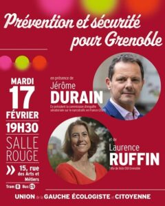 Mardi 17 février à 19 h 30, débat sur « Prévention et sécurité pour Grenoble », à la Salle Rouge 15 Rue des Arts et Métiers avec Laurence Ruffin, candidate aux élections municipales à Grenoble pour l’Union de la gauche écologiste et citoyenne et Jérôme Durain, ex-président de la commission d’enquête sénatoriale sur le narcotrafic en France en 2024.