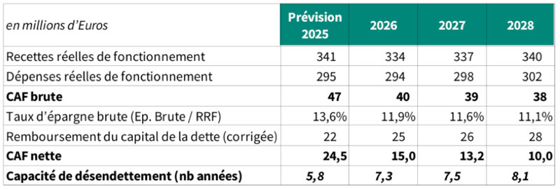 Le tableau ci-dessous renseigne sur les grands équilibres financiers jusqu’en fin 2028. La capacité de désendettement est le rapport entre le stock de la dette et la CAF brute. Il est recommandé d’être en dessous de 12 ans. Il faut remarquer la diminution des recettes de fonctionnement entre 2025 et 2026 selon les décisions nationales actuelles.