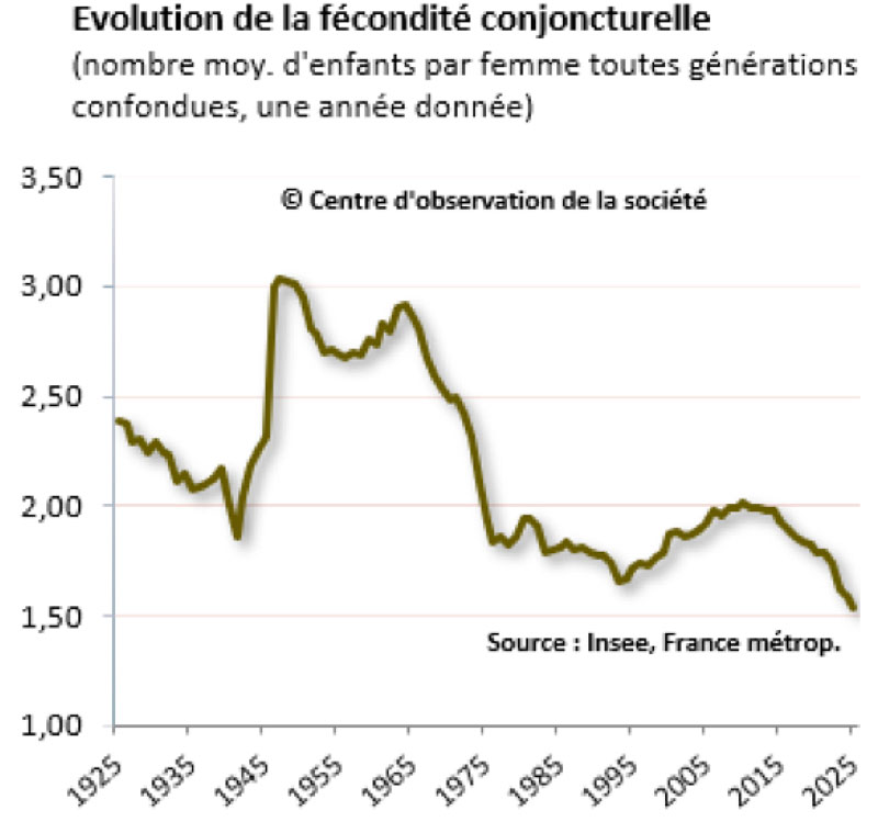 La fécondité dite « conjoncturelle » a atteint 1,53 enfant par femme en France métropolitaine en 2025 selon l’Insee, en baisse par rapport à l’année précédente. Elle se situe en dessous du niveau atteint au milieu des années 1990 (1,66 en 1994). Depuis le milieu des années 2010, la diminution est sensible, sans que l’on puisse en tirer une conclusion sur l’avenir. Depuis le XIXe siècle la France et inquiète de sa fécondité, alors qu’elle figure parmi les pays où elle est la plus élevée en Europe. Selon un article du Centre d’observation de la société, la peur de l’extinction démographique est très médiatisée.