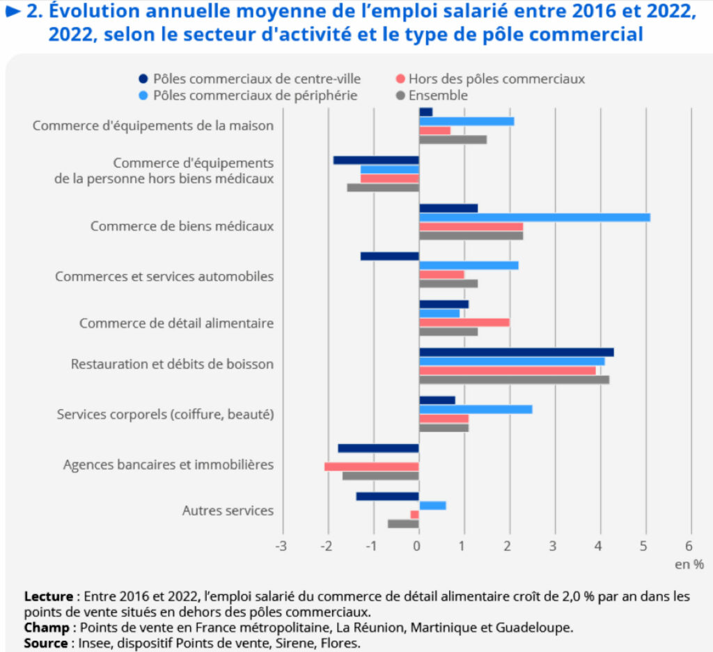 Entre 2016 et 2022, l’emploi salarié des points de vente aux ménages croît moins vite dans les pôles de centre-ville (+1,1 % par an) que dans les pôles de périphérie (+1,6 %) ou que dans ceux situés en dehors des pôles (+1,8 %). Ces évolutions dépendent aussi des secteurs d’activité. Ainsi, l’emploi salarié diminue dans le commerce d’équipement de la personne (habillement, chaussure, etc.) alors qu’il progresse fortement dans la restauration et les débits de boissons, notamment dans la restauration rapide. Dans les pôles de centre-ville, trois salariés sur dix travaillent dans la restauration.