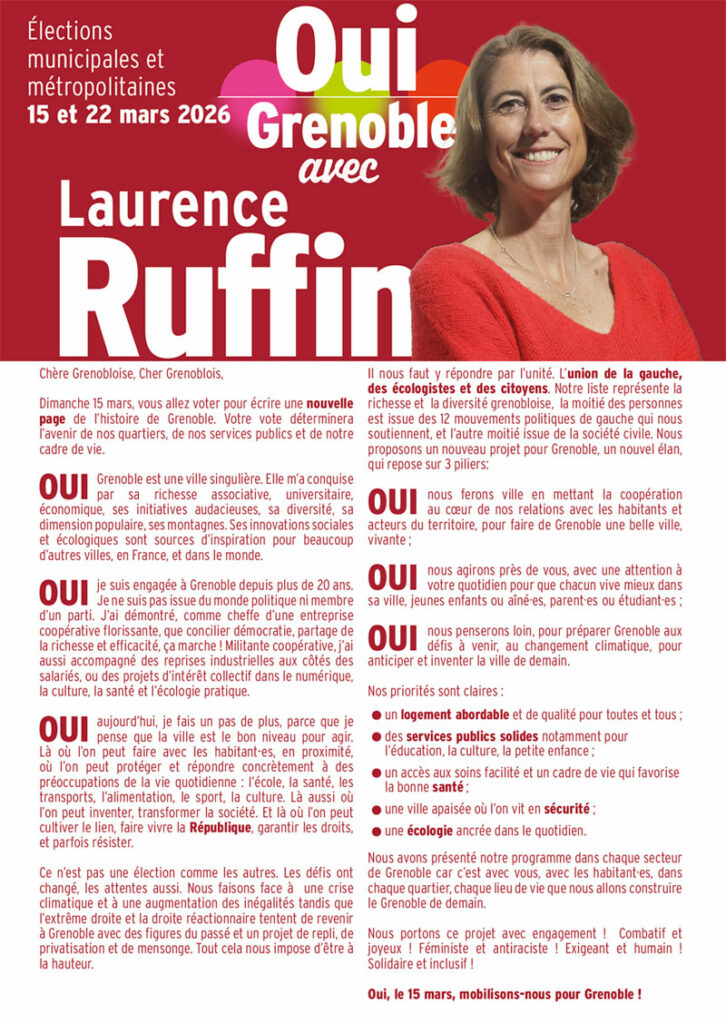 Il est hautement préférable pour les électeurs de gauche, écologistes et citoyens de faire le choix dès le 1er tour de l’union la plus large offerte par la liste OUI-Grenoble menée par Laurence Ruffin, soutenue par 12 mouvements politiques, nationaux et locaux.